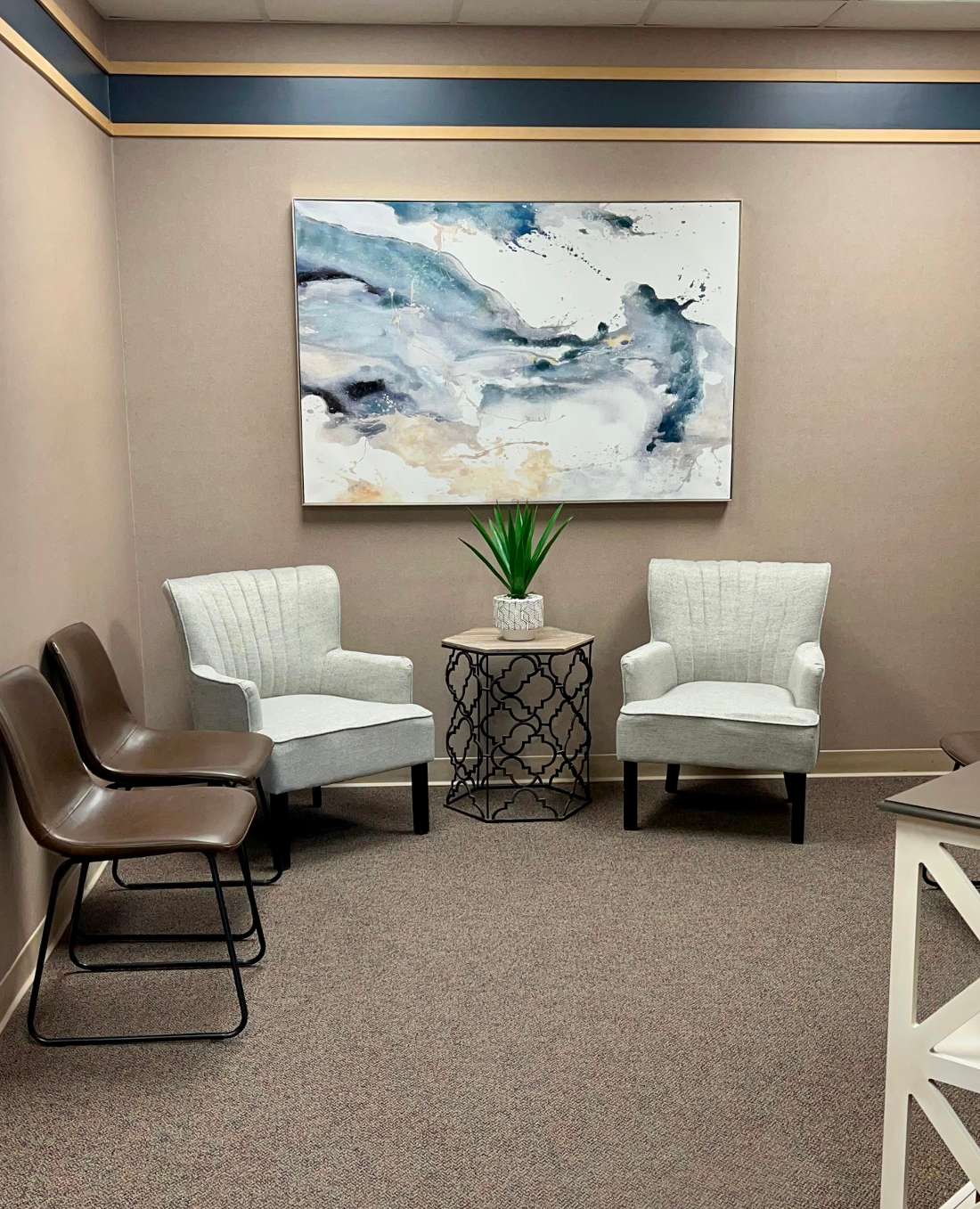 Our office offers a full comfort menu which includes: bottled water, neck pillows, eye masks, blankets, headphones, portable phone charges, guest Wi-Fi access, and a coffee center.